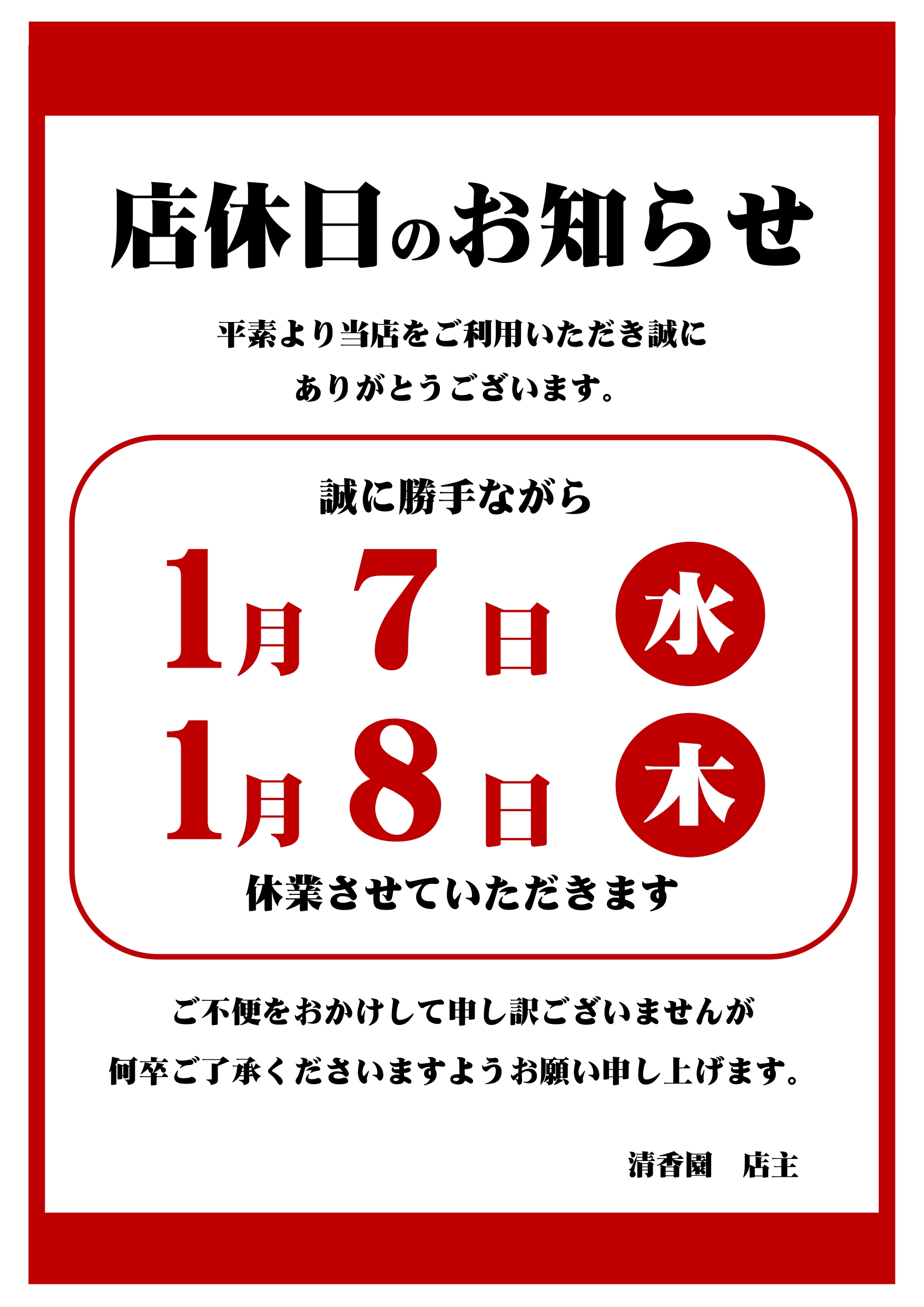 誠に勝手ながら来る1月7日(水)8日(木) お休みをさせていただきます。