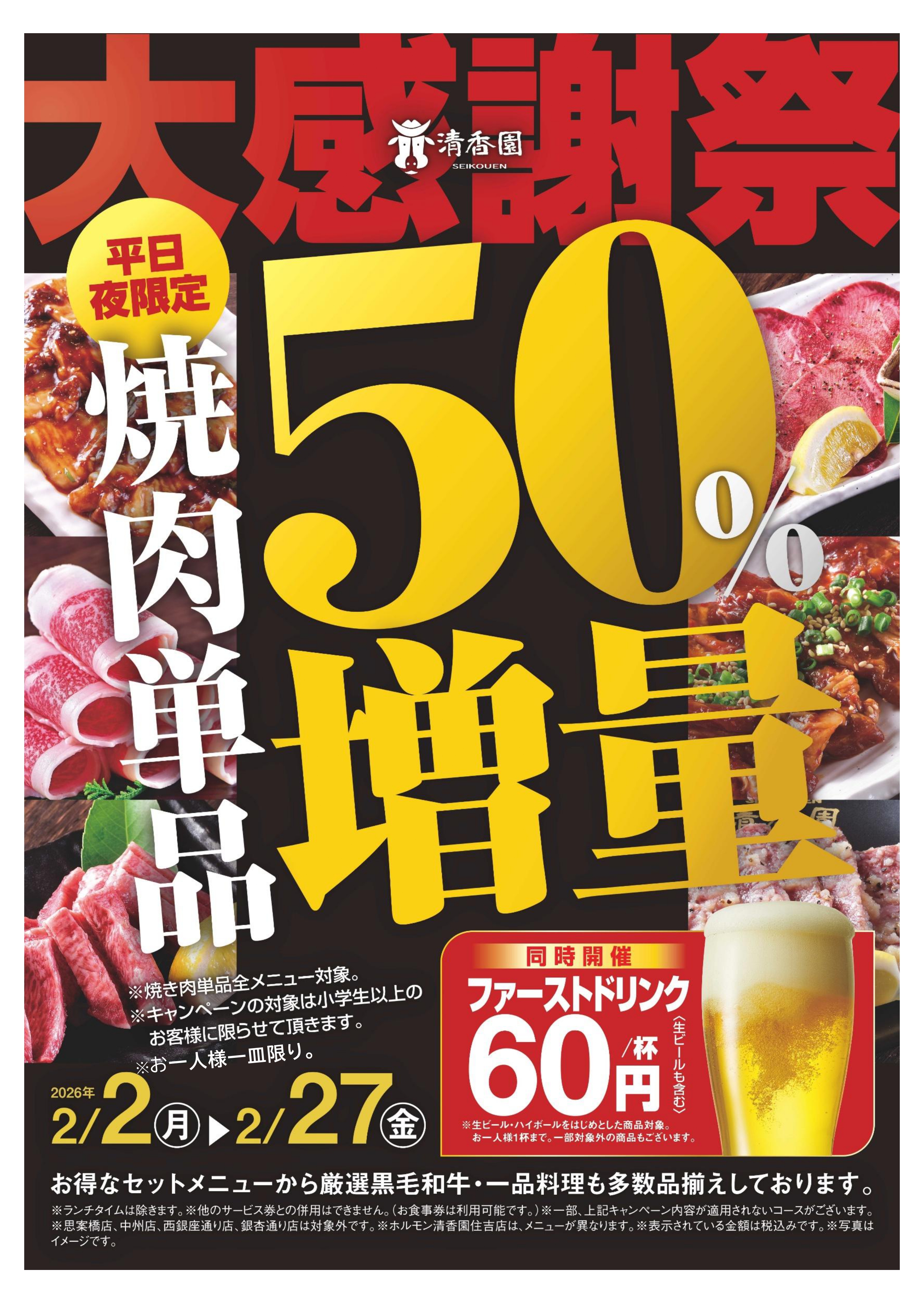 ①焼肉単品全メニューが50%増量(小学生以上のお客様対象)