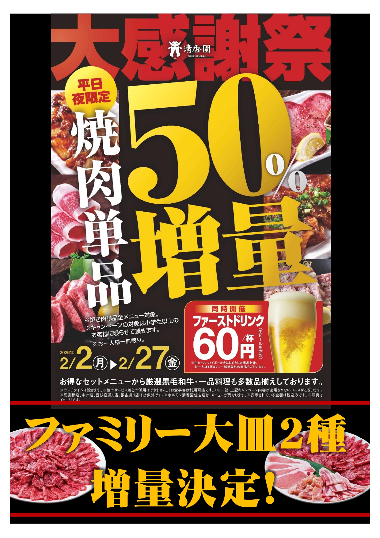 清香園トップページ>ニュース&イベント>【朗報】大感謝祭50%増量♫焼肉単品に加えファミリー大皿も追加!!